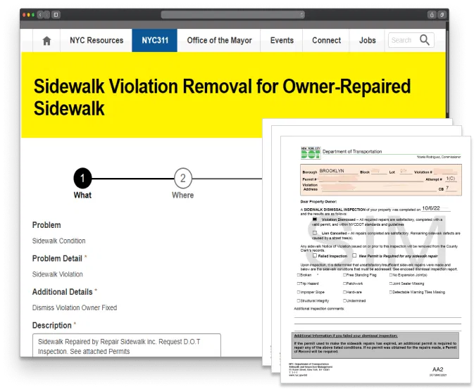 Contact us and provide us with pictures of existing sidewalk condition and DOT violation and we will give a Estimate with in 24hrs.