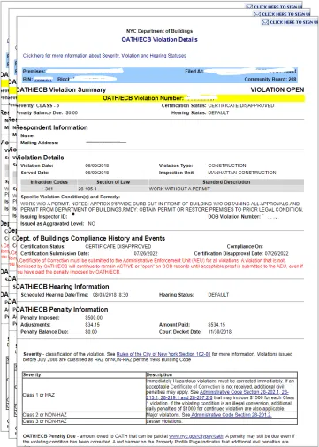 NYC Department of Transportation (DOT) will mail the homeowner a violation for the sidewalk called Preliminary Inspection Report. This report will show a diagram of your property with the sidewalk flags marked which are defects and need to be repaired.